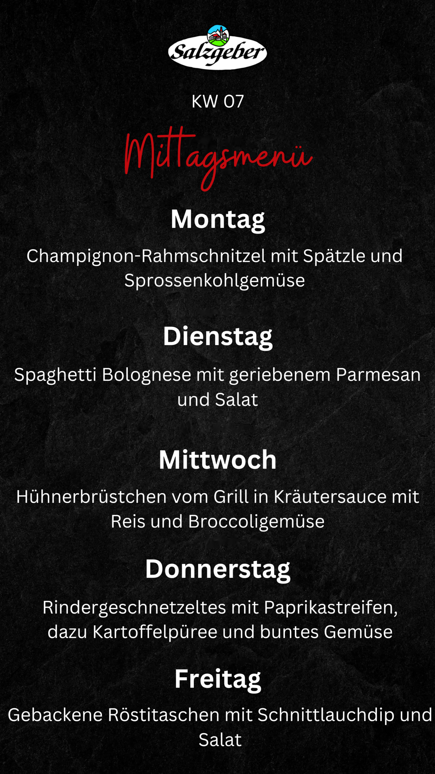 Menüplan 9. bis 13. Februar